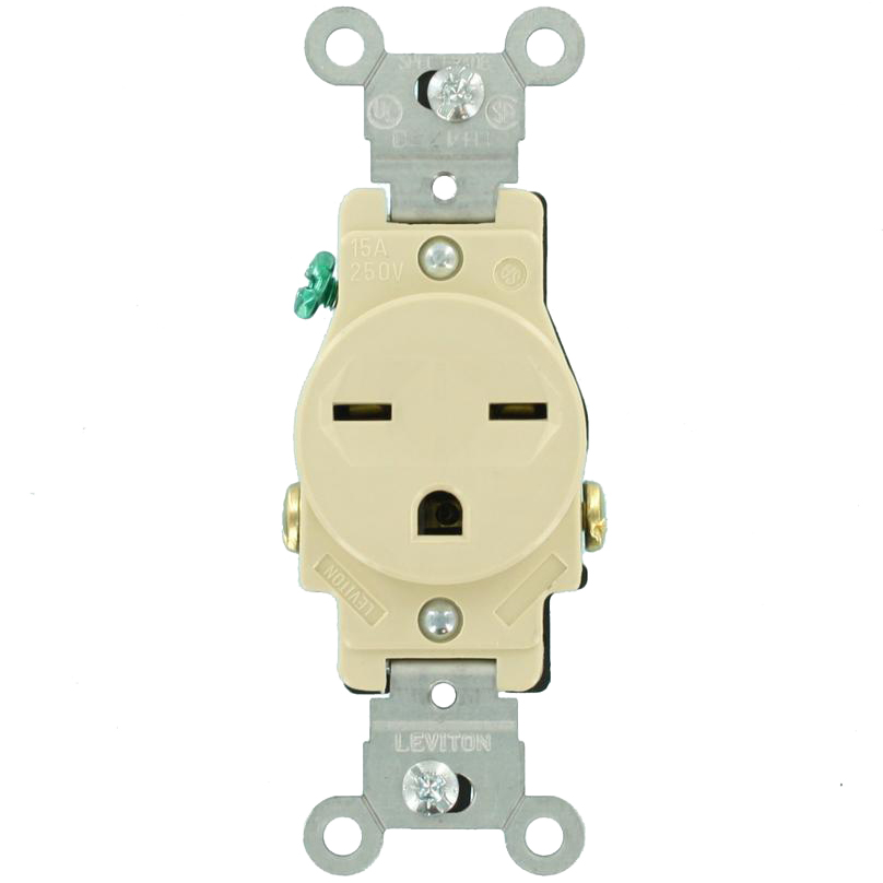 Leviton® Straight Blade Receptacle, 1 Phase Heavy Duty Grounding Single, 250 VAC, 15 A, 1-1/2 hp, 2 Poles, 3 Wires, NEMA 6-15R, Commercial Grade, -40 to 60 deg C, Side Wired Terminal, Nylon, Ivory, 4.06 in H x 1.38 in W x 16 in D