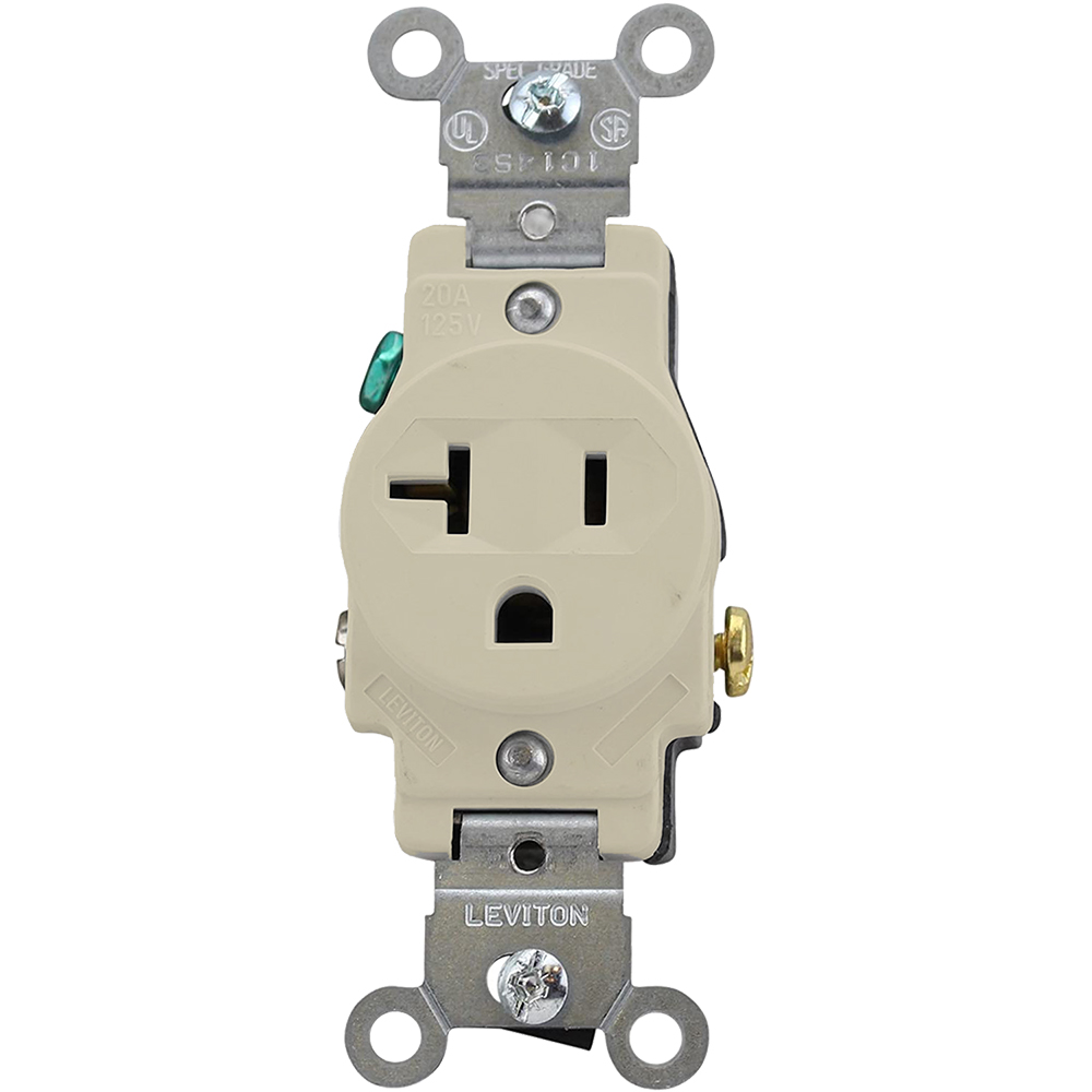 Leviton® Straight Blade Single Receptacle, Heavy Duty Grounding Narrow Body, 125 VAC, 20 A, 1 hp, 2 Pole, 3 Wires, NEMA 5-20R NEMA, Commercial Grade, NEMA WD-2/WD-6 Enclosure, -40 to 60 deg C, Side Wired Terminal, Nylon, Ivory, 4.06 in H x 1.38 in W x 1.06 in D