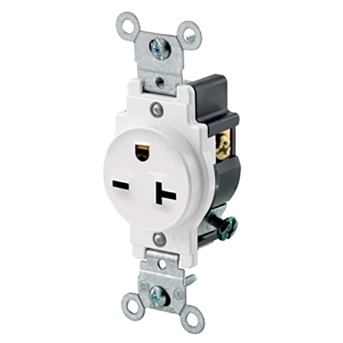 Leviton® Straight Blade Single Receptacle, Heavy Duty Grounding Narrow Body, 250 VAC, 20 A, 2 hp, 2 Pole, 3 Wires, NEMA 6-20R NEMA, Commercial Grade, NEMA WD-2/WD-6 Enclosure, -40 to 60 deg C, Side Wired Terminal, Nylon, White, 4.06 in H x 1.38 in W x 1.06 in D