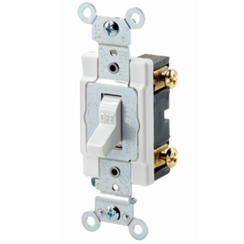 LevitonĀ® Toggle Switch, Single Pole, 20 A, 120/277 VAC, 1 hp/2 hp, Back and Side Wired Terminal, Self-Grounding, Heavy-Duty Industrial Specification Grade, Thermoplastic Body, Thermoplastic Actuator, White, 4.06 in H x 1.31 in W x 1.03 in D