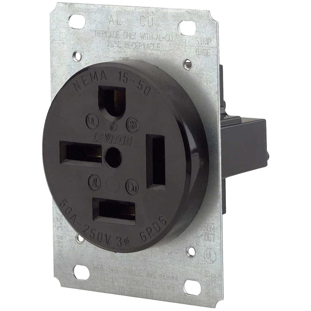 Leviton® Straight Blade Power Receptacle, 3 Phase Extra Heavy Duty Grounding, 250 VAC, 50 A, 7-1/2 hp, 3 Poles, 4 Wires, NEMA 15-50R, Commercial Grade, -40 to 60 deg C, Side Wired Terminal, Thermoplastic, Black, 3.75 in H x 2.75 in W x 2.1 in D