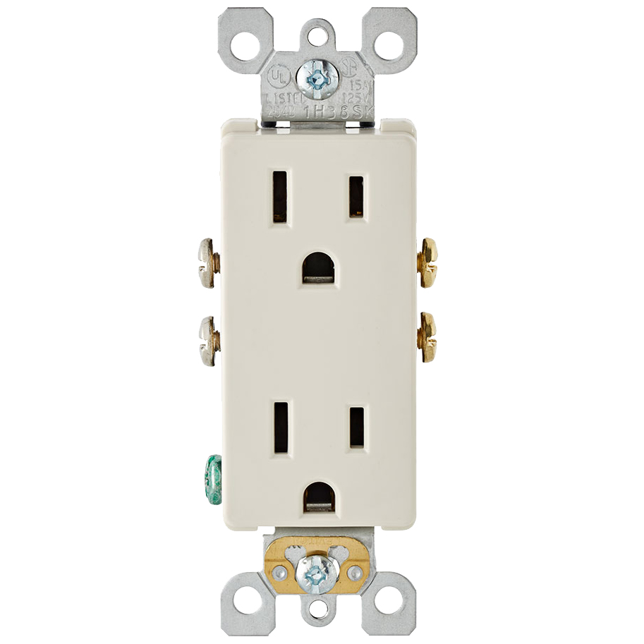 Leviton® Decora® Straight Blade Receptacle, Duplex Self-Grounding, 125 VAC, 15 A, 2 Poles, 3 Wires, NEMA 5-15R, Commercial Grade, -40 to 60 deg C, Quickwire/Push-In/Side Wired Terminal, Thermoplastic, Light Almond, 4.2 in H x 1.31 in W x 0.98 in D