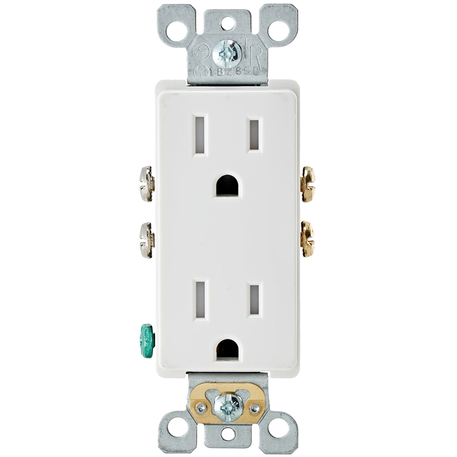 Leviton® Decora® Straight Blade Receptacle, Duplex Self-Grounding Tamper-Resistant, 125 VAC, 15 A, 2 Poles, 3 Wires, NEMA 5-15R, Commercial Grade, -40 to 60 deg C, Quickwire/Push-In/Side Wired Terminal, Thermoplastic, White, 4.2 in H x 1.33 in W x 0.76 in D