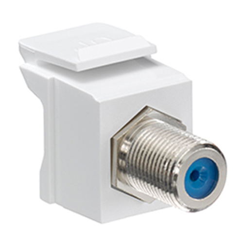Leviton® QuickPort® Decora® F-Type Adapter, Feed Through, Female End A Type, Female End B Type, RG-6/RG-59 Coaxial Cable, 75 Ohm Impedance, Snap-In, Flush/Surface, Brass, Nickel Plated, White, 0.64 in H x 0.58 in W x 1.24 in D