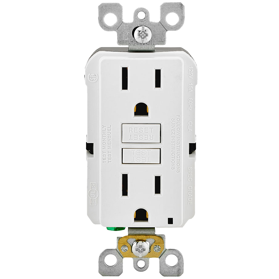 Leviton® SmartlockPro® Slim® GFCI Receptacle, Duplex Monochromatic Non-Tamper-Resistant Self-Test, 125 VAC, 15 A, 1 hp, 60 Hz, 2 Poles, 3 Wires, NEMA 5-15R, Residential Grade, -35 to 66 deg C, Back or Side Wired Terminal, Polycarbonate/Thermoplastic, White, 4.21 in H x 1.69 in W x 1.32 in D