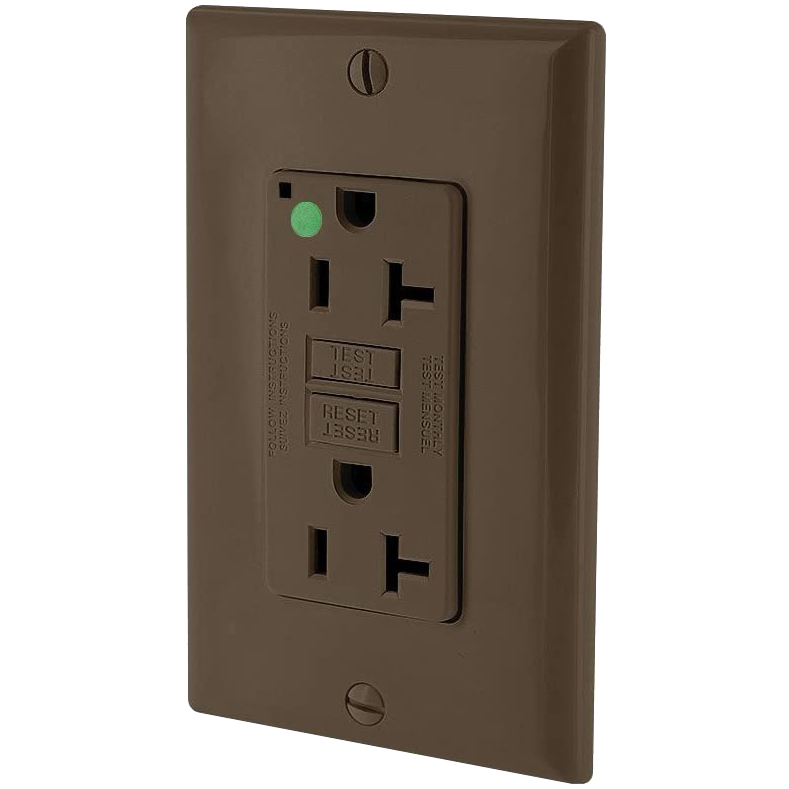 Leviton® SmartlockPro® Slim® GFCI Receptacle, Duplex Feed Through Non-Tamper-Resistant Self-Test, 125 VAC, 20 A, 1 hp, 2 Poles, 3 Wires, NEMA 5-20R, Extra Heavy Duty/Hospital Grade, -35 to 66 deg C, Back or Side Wired Terminal, Polybutylene Terephthalate/Polycarbonate, Brown, 4.05 in H x 1.74 in W x 1.36 in D