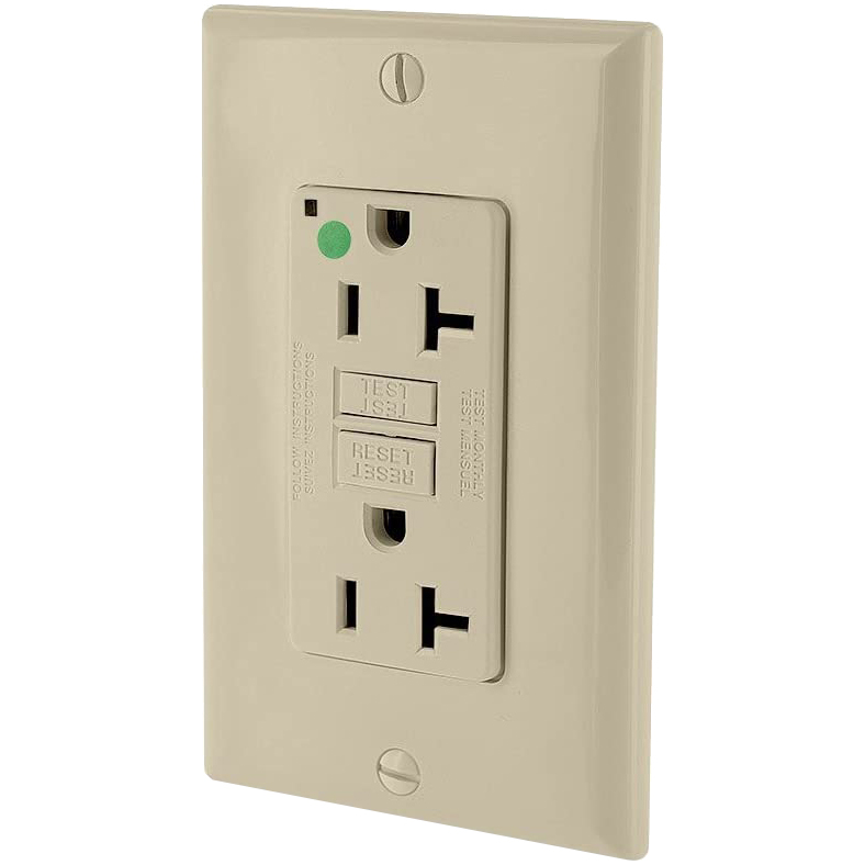 Leviton® SmartlockPro® Slim® GFCI Receptacle, Duplex Feed Through Non-Tamper-Resistant Self-Test, 125 VAC, 20 A, 1 hp, 2 Poles, 3 Wires, NEMA 5-20R, Extra Heavy Duty/Hospital Grade, -35 to 66 deg C, Back or Side Wired Terminal, Polybutylene Terephthalate/Polycarbonate, Ivory, 4.05 in H x 1.74 in W x 1.36 in D
