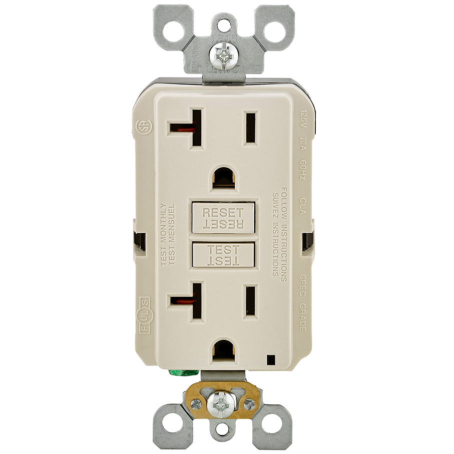 Leviton® SmartlockPro® Slim® GFCI Receptacle, Feed Through Non-Tamper-Resistant Self-Test Standard Duplex, 125 VAC, 20 A, 1 hp, 2 Poles, 3 Wires, NEMA 5-20R, Residential Grade, -35 to 66 deg C, Back or Side Wired Terminal, Polycarbonate/Thermoplastic, Light Almond, 4.21 in H x 1.69 in W x 1.4 in D