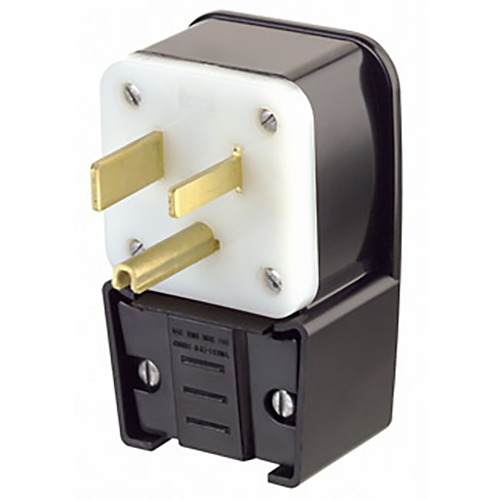 LevitonĀ® Straight Blade Plug, Angled Cable Mount Grounding, 250 VAC, 50 A, 3 hp, 2 Poles, 3 Wires, NEMA 6-50P, Industrial Grade, 5/8 to 1-3/8 in Cord Dia, -40 to 60 deg C, Nylon, Black, 4.37 in H x 2.76 in W x 1.89 in D