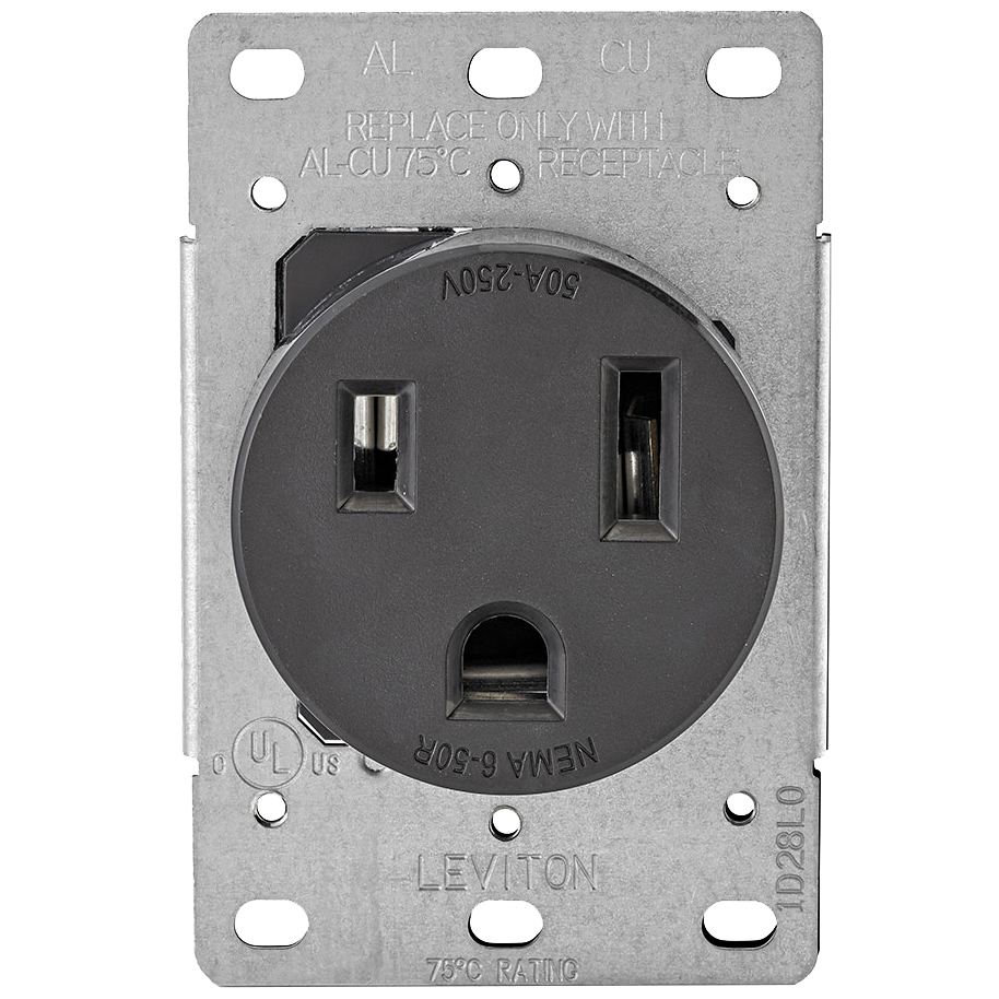 Leviton® Straight Blade Receptacle, Grounding, 250 VAC, 50 A, 7-1/2 hp, 2 Poles, 3 Wires, NEMA 6-50R, Industrial Grade, -40 to 60 deg C, Side Wired Terminal, Thermoplastic, White, 3.75 in H x 2.42 in W x 1.57 in D