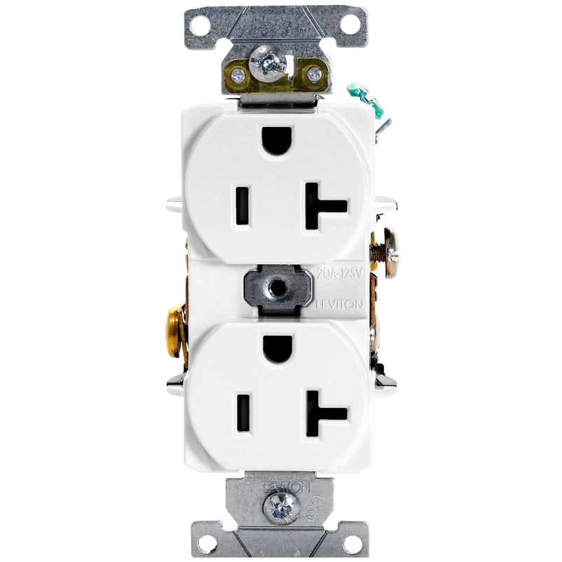 Leviton® Straight Blade Duplex Receptacle, Heavy Duty, 125 VAC, 20 A, 1 hp, 2 Pole, 3 Wires, NEMA 5-20R NEMA, Industrial Grade, NEMA WD-1/WD-6 Enclosure, -40 to 60 deg C, Back and Side Wired Terminal, Thermoplastic, White, 4.06 in H x 1.33 in W x 19 in D