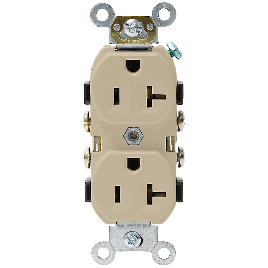 Leviton® Straight Blade Receptacle, 1 Phase Duplex Indented Face, 125 VAC, 20 A, 1 hp, 2 Poles, 3 Wires, NEMA 5-20R, Commercial Grade, -40 to 60 deg C, Side Wired Terminal, Thermoplastic, Ivory, 4.06 in H x 1.53 in W x 1.08 in D