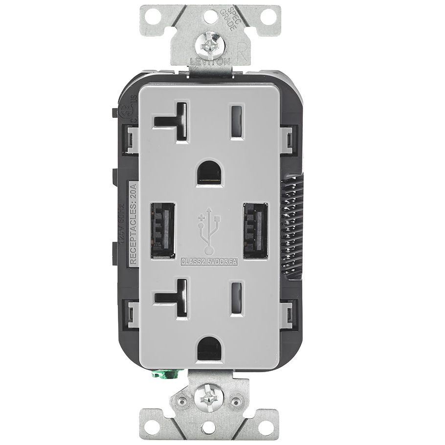 Leviton® Decora® Receptacle and USB Charger, Decora® Duplex Tamper-Resistant, 20 A, 125 VAC, 14 to 12 AWG Wire, Type A USB Type, 3.6 A at 5 VDC USB Rating, 4.04 in H x 1.73 in W, Back and Side Wired, Wall, Commercial/Residential Grade, Thermoplastic, Gray, Environmental Conditions: -10 to 40 deg C Operating Temperature
