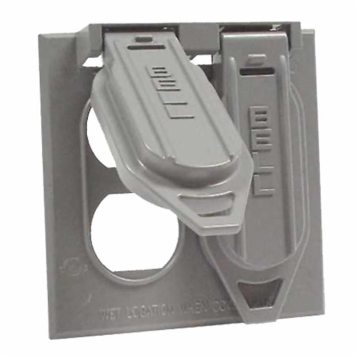 BELLĀ® Self-Closing Flip Cover, Weatherproof, 2 Gang (2) Duplex, Vertical Mount, Die Cast Aluminum, Powder Coated, Gray, 4-17/32 in H x 4-17/32 in W x 1 in D