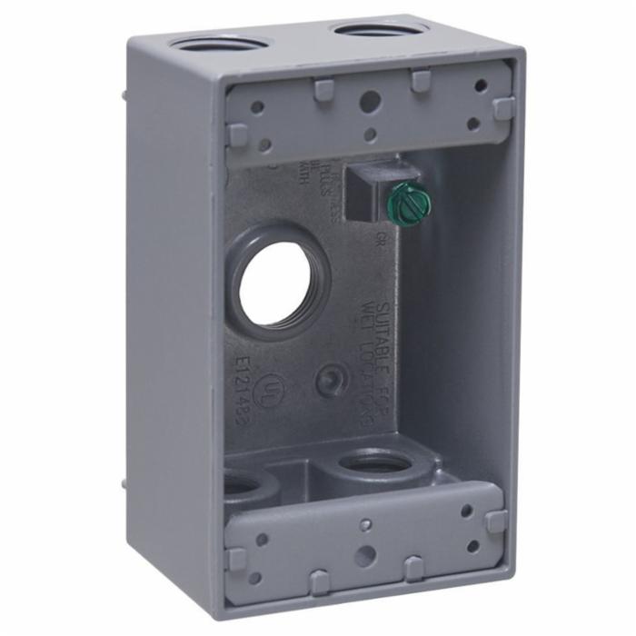 BELLĀ® Weatherproof Outlet Box, 1 Gang, 5 Outlet, 1/2 in Outlet, Threaded Outlet, NEMA 3R, 18.3 cu-in, Die Cast Aluminum, Powder Coated, Gray, 4-1/2 in H x 2-3/4 in W x 2 in D