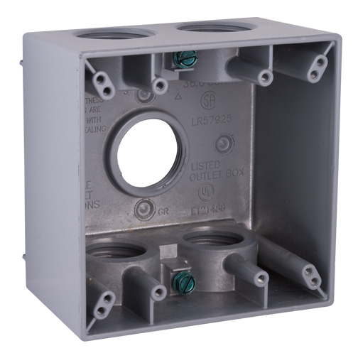 BELLĀ® Weatherproof Outlet Box, 2 Gang, 5 Outlet, 3/4 in Outlet, Threaded Outlet, NEMA 3R, 36 cu-in, Die Cast Aluminum, Powder Coated, Gray, 4-1/2 in H x 4-1/2 in W x 2-5/8 in D