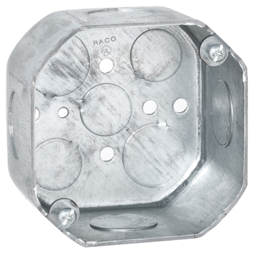 RACO® Octagon Box, 9 Knockouts, 1/2 and 3/4 in Knockouts, Conduit Knockout Cable Entry, Octagon, 21.5 cu-in, Steel, Pre-Galvanized, 4 in H x 4 in W x 2-1/8 in D