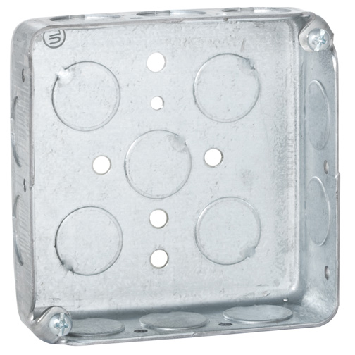 RACO® Square Box, (15) 1/2 in Conduit Knockouts, 18 cu-in, Drawn, Steel, Pre-Galvanized, 4 in H x 4 in W x 1-1/4 in D