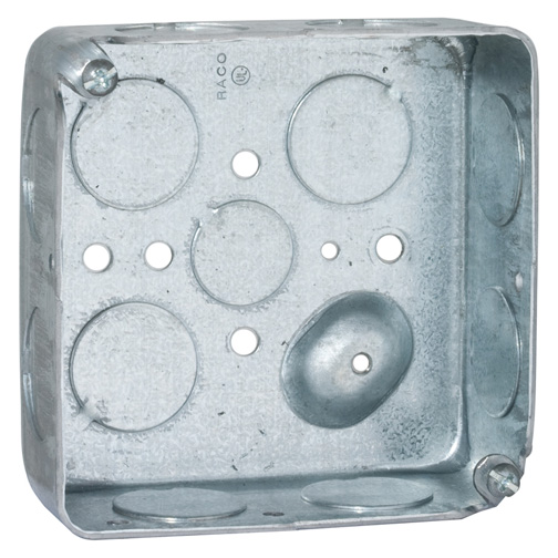 RACO® Square Box, (1) 1/2 in and (11) 3/4 in Conduit Knockouts, 21 cu-in, Steel, Pre-Galvanized, 4 in H x 4 in W x 1-1/2 in D