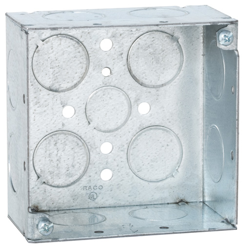 RACO® Square Box, (1) 1/2 in and (12) 3/4 in Knockouts, Knockouts Cable Entry, 30.3 cu-in, Welded, Steel, Pre-Galvanized, 4 in H x 4 in W x 2-1/8 in D