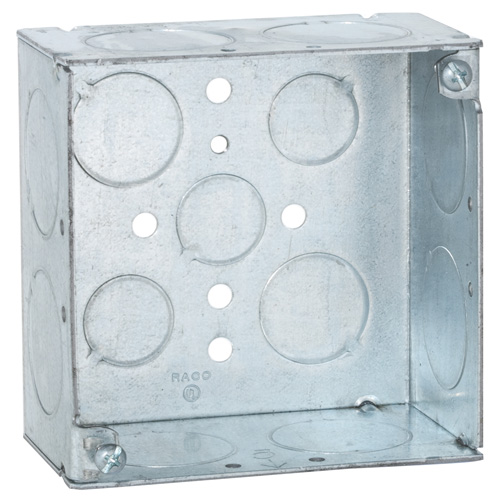 RACO® Square Box, (2) 1/2 in, (2) 3/4 in and (8) 1 in Knockouts, Knockouts Cable Entry, 30.3 cu-in, Welded, Steel, Pre-Galvanized, 4 in H x 4 in W x 2-1/8 in D