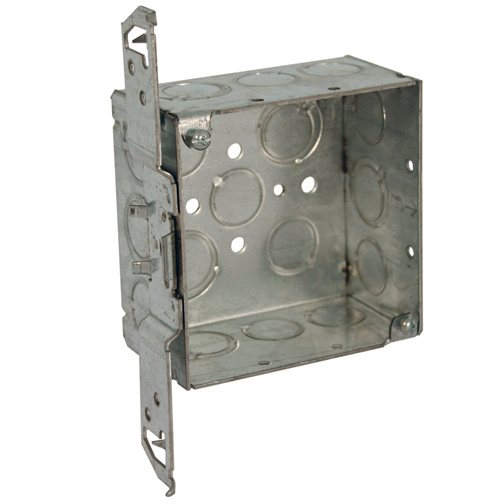 RACO® 4 in Square Bracketed Box, 14 Knockouts, 1/2 in Knockouts, Box-Loc® MS Bracket, Steel, 1-1/2 in D