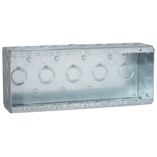 RACO® Masonry Box, Non-Gangable, 5 Outlets, 5 Gang, 23 Knockouts, 1/2 and 3/4 in Conduit Knockouts, 79.5 cu-in, Welded, Steel, Pre-Galvanized, 3-3/4 in H x 9-7/32 in W x 2-1/2 in D