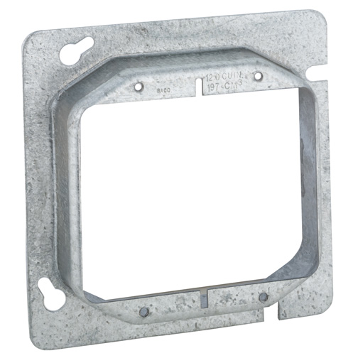 RACO® Raised Device Ring, Square, 2 Gang, 12 cu-in, Steel, Pre-Galvanized, 4-11/16 in H x 4-11/16 in W x 1 in D