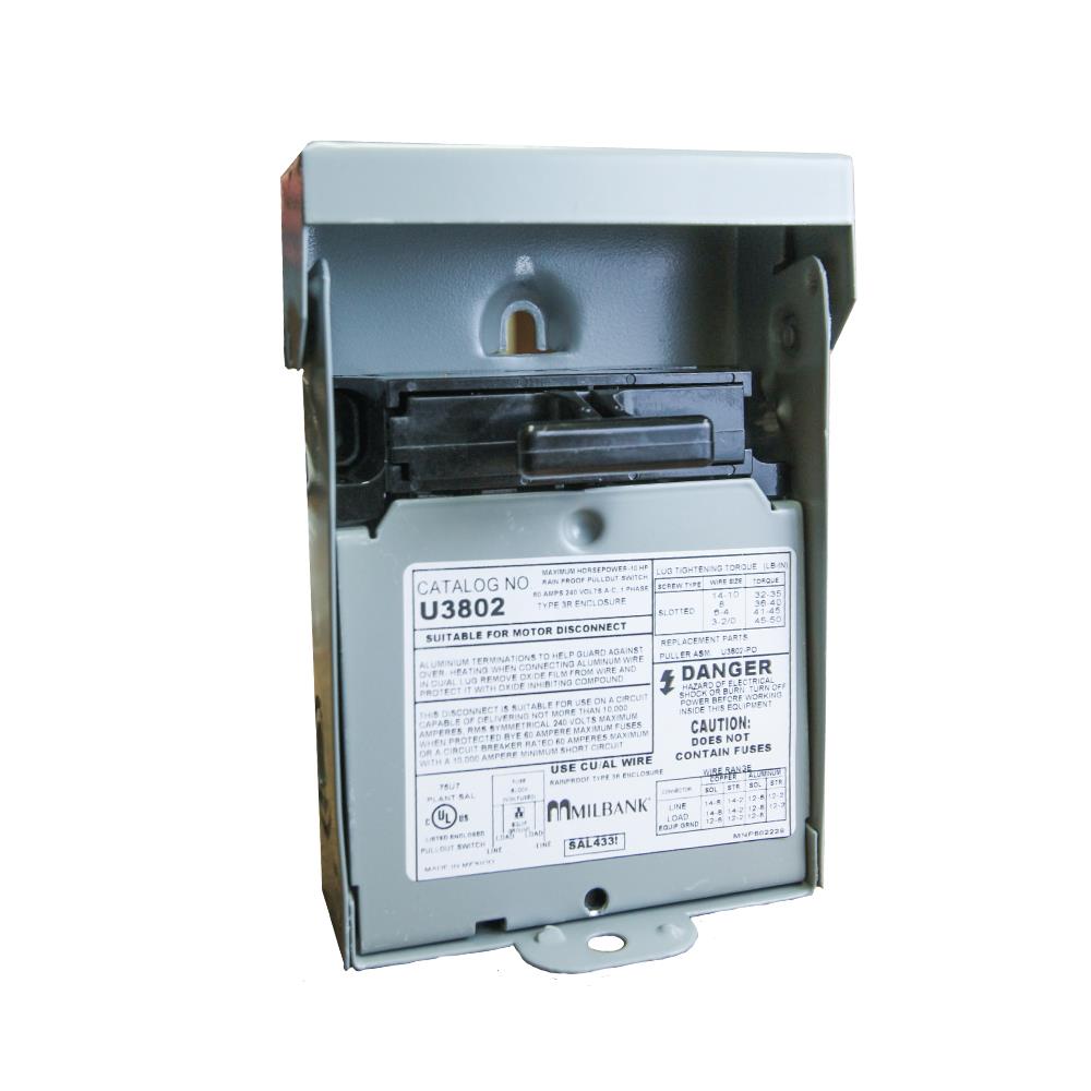 MilbankĀ® Air-Conditioner Disconnect, Non-Fusible, 240 VAC, 60 A, 10 hp, 1 Phase, 2 Poles, 10 kA Short Circuit, NEMA 3R, Surface Mount, 7-1/2 in H x 5 in W x 2-1/2 in D, Steel, Light Gray, Baked Powder Coated/Galvanized
