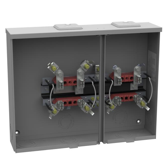 Milbank® Ringless Multi-Position Meter Socket With Horn Bypass, 4 Jaw, 2 Position, 300 VAC, 100 A, 1 Phase, 60 Hz, Overhead/Underground Feed, 2 AWG to 350 MCM Wire, Small Closing Plate, Lay In Terminal, NEMA 3R Enclosure, Glass Polyester Insulation, Galvanized Steel, Powder Coat Finish, 20-5/16 in W x 4-1/2 in D x 16 in H