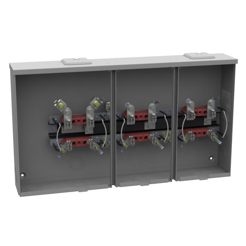Milbank® Ringless Multi-Position Meter Socket With Horn Bypass, 4 Jaw, 3 Position, 300 VAC, 100 A, 1 Phase, 60 Hz, Overhead/Underground Feed, 2 AWG to 350 MCM Wire, Small Closing Plate, Lay In Terminal, NEMA 3R Enclosure, Glass Polyester Insulation, Galvanized Steel, Powder Coat Finish, 28-1/2 in W x 4-1/2 in D x 16 in H