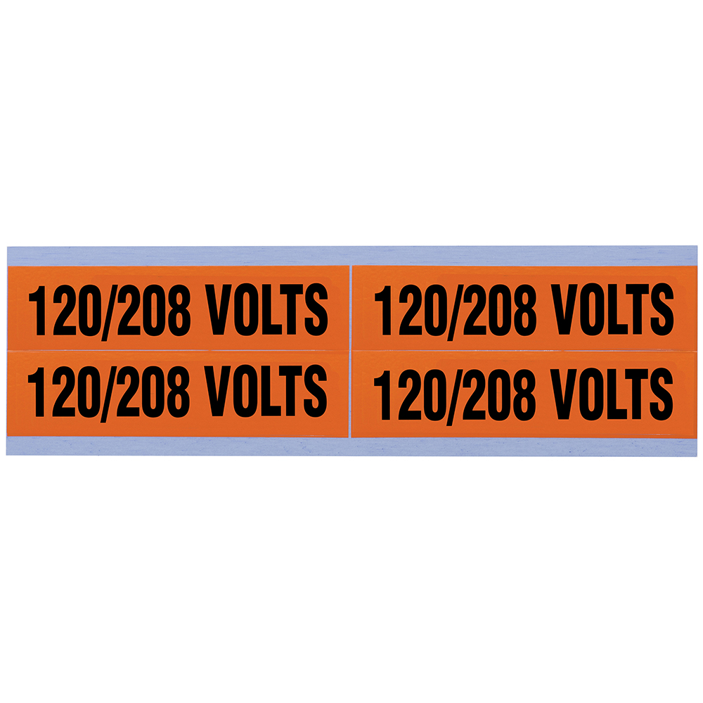 IDEALĀ® Conduit and Voltage Marker, Medium, 4-1/2 in Label Length, 1-1/8 in Label Width, 120/208 VOLTS Legend, Black Legend, Orange Background, Vinyl Impregnated Cloth
