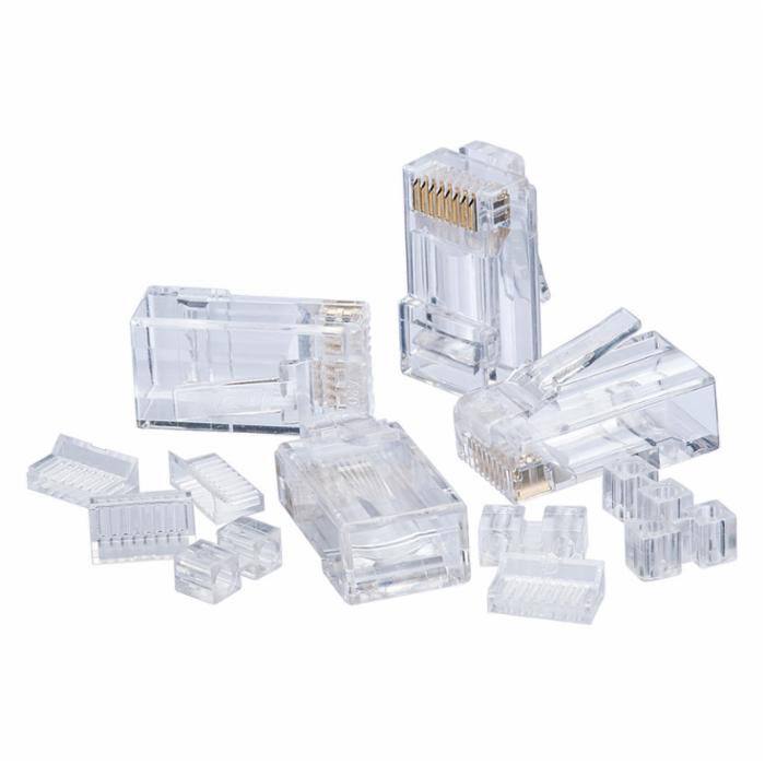 - 8 position, 8 contact RJ-45 modular plug for Cat 6, 100Ω balanced twisted pair 250 MHz cables.