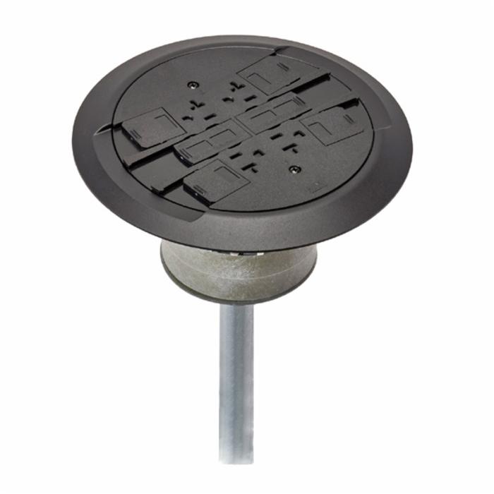 Wiremold® TopGuard™ Poke-Through Assembled Unit, Multi-Service, Series: RC4, 4 in, 1/2 in, 3/4 in Knockout, 2 Gang, 24.5 cu-in, Fire Rated Device Type, 8-1/4 in Length, 8-1/4 in Width, 9-1/16 in D, For Use With: Carpet, Tile, Wood Covered Floor, 8-1/4 in Cover, Aluminum/Steel, Black Painted