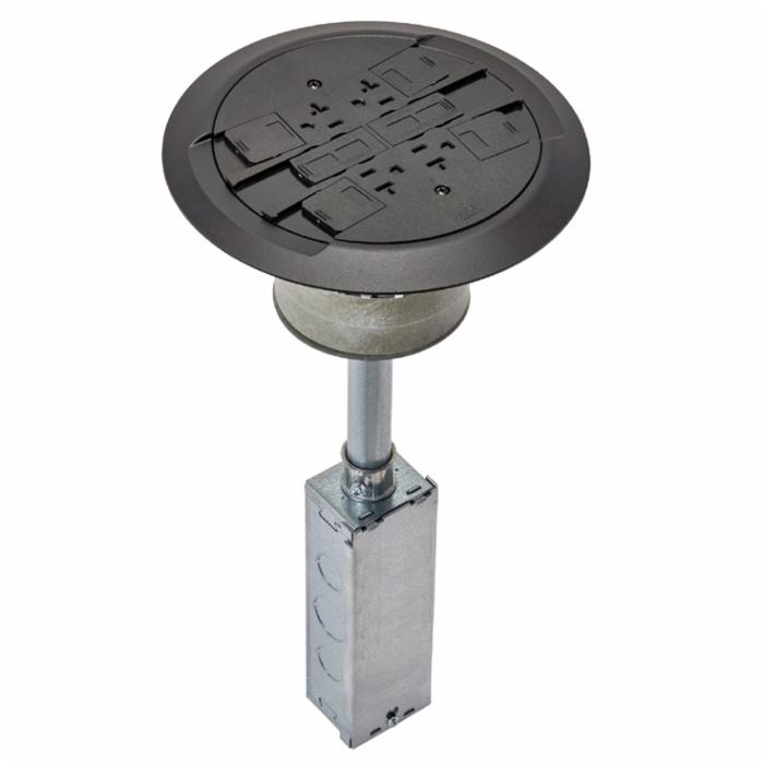 Wiremold® Assembled Poke Through Device, Multi-Service, Series: RC4, 4 in, 1/2 to 3/4 in Knockout, 2 Gang, 24.5 cu-in, Flush Device Type, For Use With: On Tile or Carpet Floor, Black Painted Flange with Black Nonmetallic Cover, 8-1/4 in Dia x 16-3/8 in L,