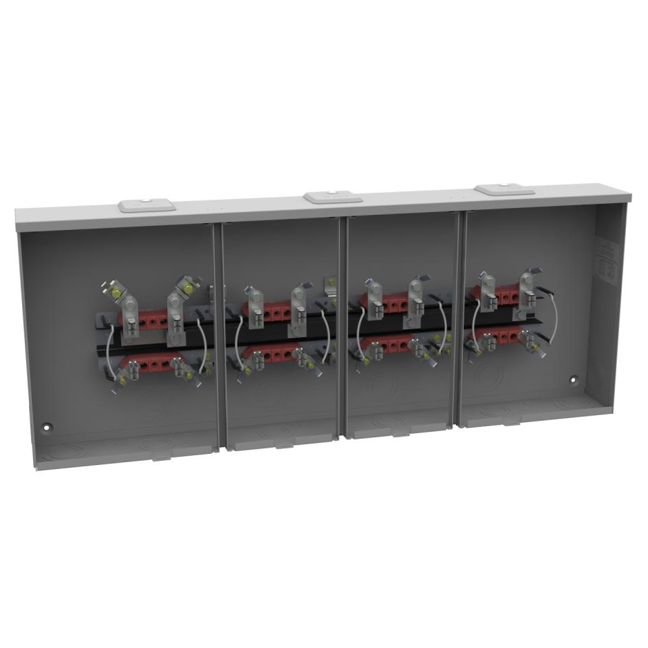 Milbank® Ringless Multi-Position Meter Socket With Horn Bypass, 4 Jaw, 4 Position, 300 VAC, 100 A, 1 Phase, 60 Hz, Overhead/Underground Feed, 2 AWG to 350 MCM Wire, Small Closing Plate, Lay In Terminal, NEMA 3R Enclosure, Glass Polyester Insulation, Galvanized Steel, Powder Coat Finish, 40-11/16 in W x 4-1/2 in D x 16 in H