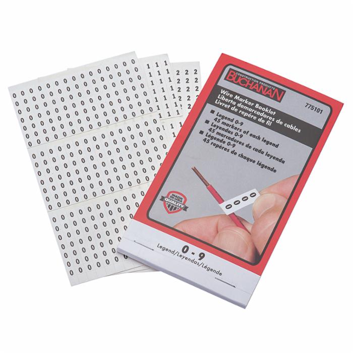 BUCHANAN Wire Marker Booklet, Pre-Printed, 1-1/2 in Length, 1/4 in Width, 0 to 9 Legend, Black/White Legend/Background, Plastic Impregnated Cloth