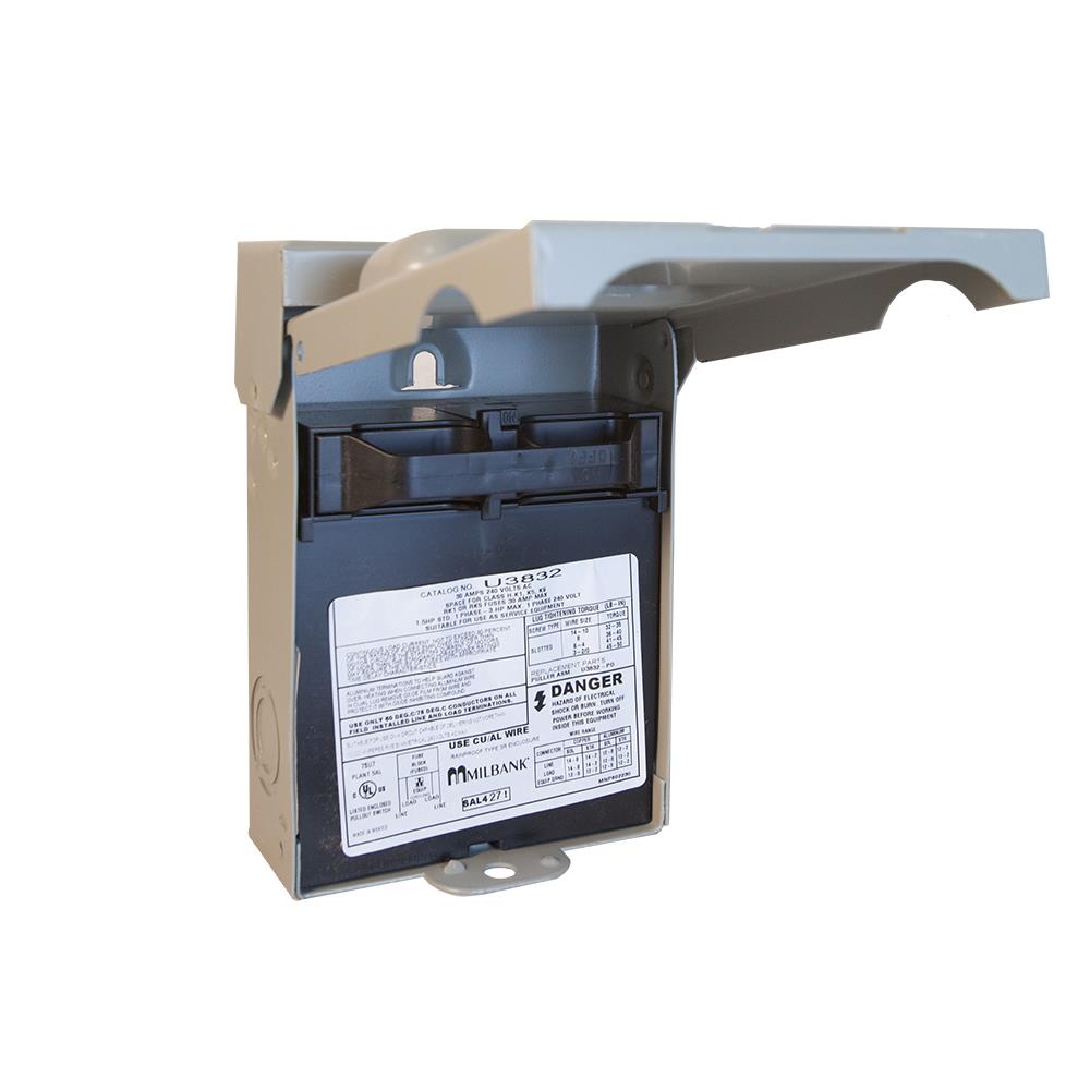 MilbankĀ® Air-Conditioner Disconnect, Fusible, 240 VAC, 30 A, 3 hp, 2 Poles, 10 kA Short Circuit, NEMA 3R, Surface Mount, 7 in H x 5 in W x 2-1/8 in D, Steel, Gray, Painted