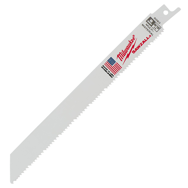 Milwaukee® Reciprocating Saw Blade, Straight Back Thin Kerf, Series: SAWZALL®, 8 in Length, 3/4 in Width, 0.05 in Thickness, 8/12, Matrix II Teeth, 1/2 Tang, Universal Tang, High Speed Steel-Co 8 Cutting Edge, Bi-Metal Body, Bright, Applicable Materials: Cast Iron, Most Metal, Plastic and Wood