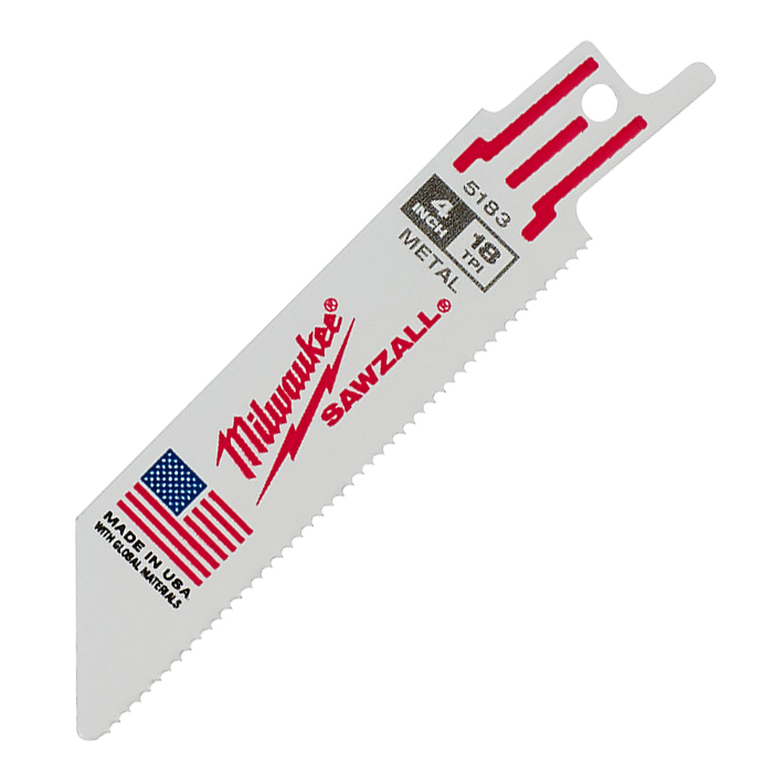 Milwaukee® Reciprocating Saw Blade, Double Duty Straight Back Thin Kerf, Series: SAWZALL®, 4 in Length, 3/4 in Width, 0.035 in Thickness, 18, Matrix II Teeth, 1/2 Tang, Universal Tang, High Speed Steel-Co 8 Cutting Edge, Bi-Metal Body, Bright, Applicable Materials: Most Metal