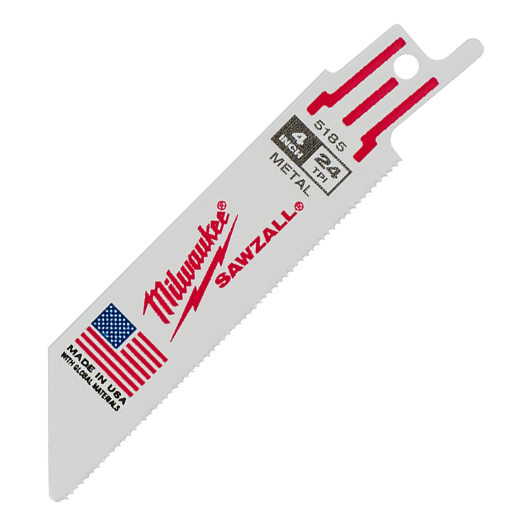 Milwaukee® Reciprocating Saw Blade, Double Duty Straight Back Thin Kerf, Series: SAWZALL®, 4 in Length, 3/4 in Width, 0.035 in Thickness, 24, Matrix II Teeth, 1/2 Tang, Universal Tang, High Speed Steel-Co 8 Cutting Edge, Bi-Metal Body, Bright, Applicable Materials: Most Metal