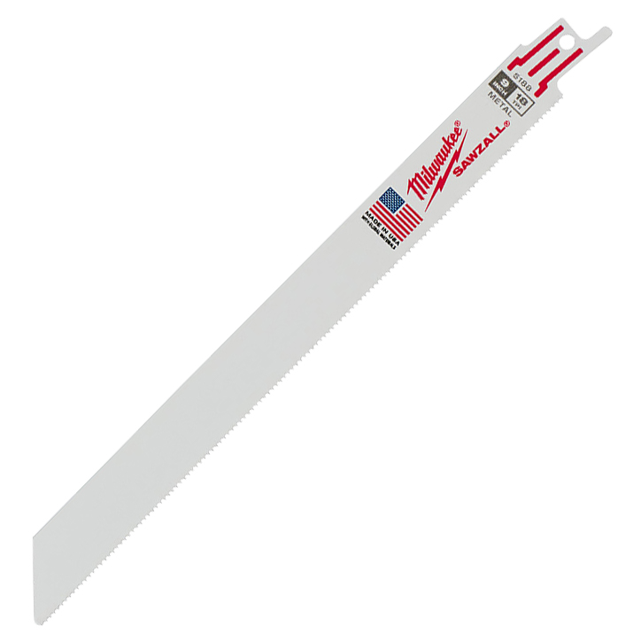 Milwaukee® Reciprocating Saw Blade, Double Duty Straight Back Thin Kerf, Series: SAWZALL®, 9 in Length, 3/4 in Width, 0.035 in Thickness, 18, Matrix II Teeth, 1/2 Tang, Universal Tang, High Speed Steel-Co 8 Cutting Edge, Bi-Metal Body, Bright, Applicable Materials: Most Metal