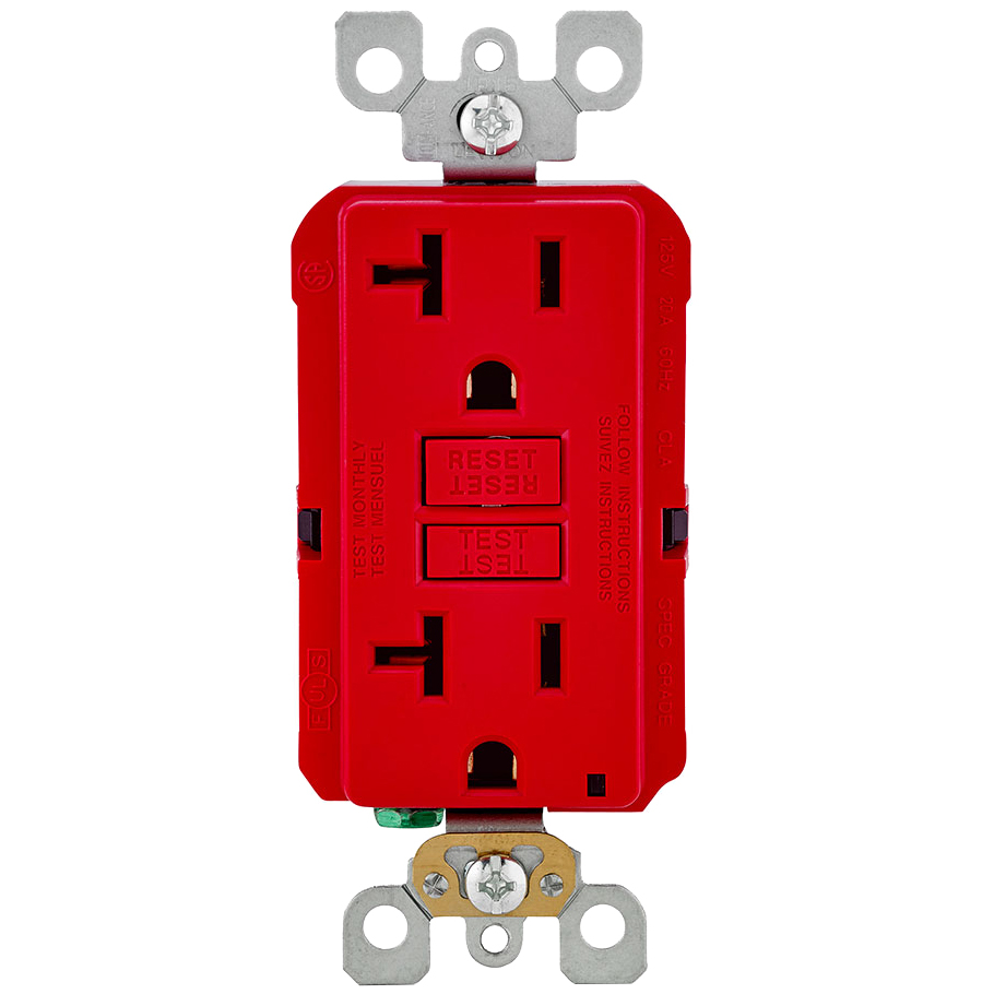 Leviton® SmartlockPro® Slim® GFCI Receptacle, Feed Through Non-Tamper-Resistant Self-Test Standard Duplex, 125 VAC, 20 A, 1 hp, 2 Poles, 3 Wires, NEMA 5-20R, Residential Grade, -35 to 66 deg C, Back or Side Wired Terminal, Polycarbonate/Thermoplastic, Red, 4.21 in H x 1.69 in W x 1.4 in D