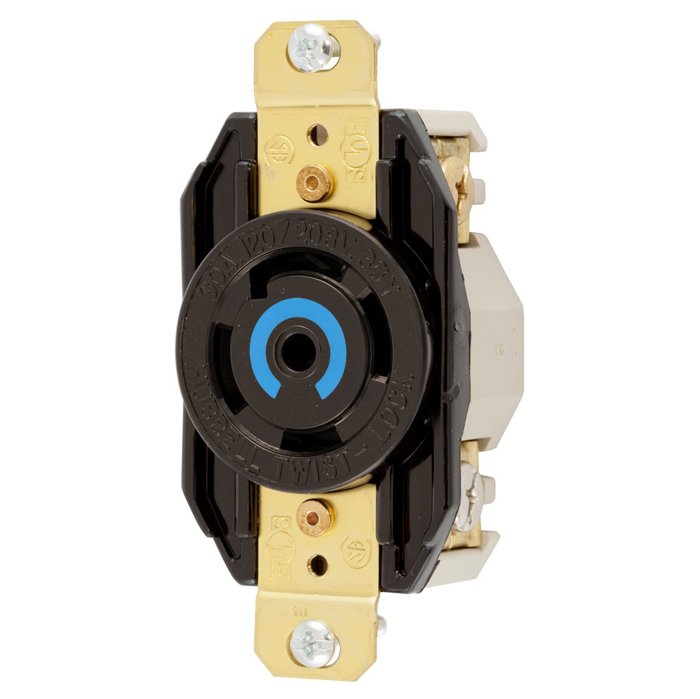 Wiring Device-Kellems Twist-Lock® Insulgrip® Locking Receptacle, Flush Mount Grounding Heavy Duty Single, 120/208Y VAC, 30 A, 3 hp, 4 Pole, 5 Wires, NEMA L21-30R, Industrial Grade, NEMA 4X/12/IP20 Enclosure, -40 to 75 deg C, Screw Terminal, Composite/Thermoplastic, Black, 3.28 in H x 1.7 in W x 1.23 in D