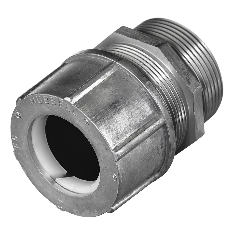 Wiring Device-Kellems Cord Connector, Form 6 Standard Duty, 2 in Trade, 1 Conductor, 1.50 to 1.63 in Cable Openings, Straight Male Connection, Aluminum, Machined, Metallic/White, -30 to 225 deg F