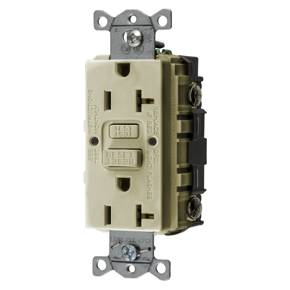 Wiring Device-Kellems GFCI Receptacle, 1 Phase Decorator Duplex Self-Test, 125 VAC, 20 A, 1 hp, 60 Hz, 2 Pole, 3 Wires, NEMA 5-20R, Commercial Grade, -30 to 150 deg F, Back or Side Wired/Screw Terminal, Composite/Thermoplastic, Ivory, 3.27 in H x 1.75 in W x 1.47 in D