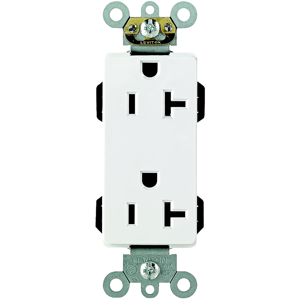 Leviton® Lev-Lok® Decora Plus™ Straight Blade Receptacle, Duplex Self-Grounding, 125 VAC, 20 A, 1 hp, 2 Poles, 3 Wires, NEMA 5-20R, Heavy-Duty Industrial Specification Grade, -40 to 60 deg C, Modular Terminal, Nylon, White, 4.06 in H x 1.53 in W x 1.22 in D