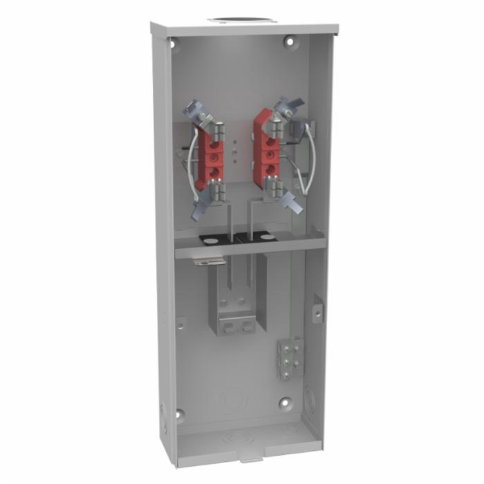 MilbankĀ® Ringless Single Position Meter Socket With Main With Horn Bypass, 4 Jaw, 120/240 VAC, 100 A, 1 Phase, 60 Hz, Overhead Feed, 6 to 2/0 AWG Wire, Main Breaker Provision, Small Hub Opening, Lay In Terminal, NEMA 3R Enclosure, Glass Polyester Insulation, Galvanized Steel, Powder Coat Finish, 8-1/8 in W x 3-3/4 in D x 22 in H