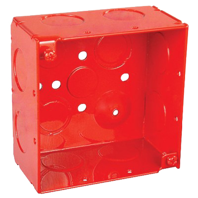 Garvin® Life Safety Box, Square, 12 Knockouts, 1/2 and 3/4 in Conduit Knockouts, Steel, Red, 4 in H x 4 in W x 2-1/8 in D