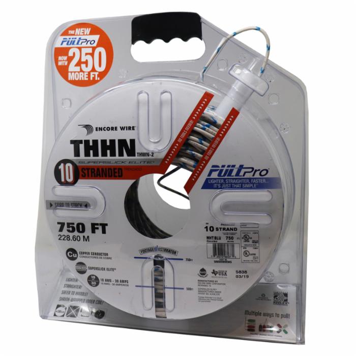 Encore Wire SuperSlick Elite® THHN Copper Building Wire, 10 AWG, Stranded, White, Blue Stripe, (2) 750 ft PullPro® Cartons